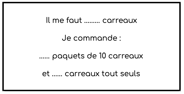Même exercice, mais le groupe de carreleurs “compte” les carreaux dont il a besoin et donne au groupe vendeur uniquement le nombre total de carreaux à couvrir. La validation est obtenue par le recouvrement effectif avec les pièces fournies.