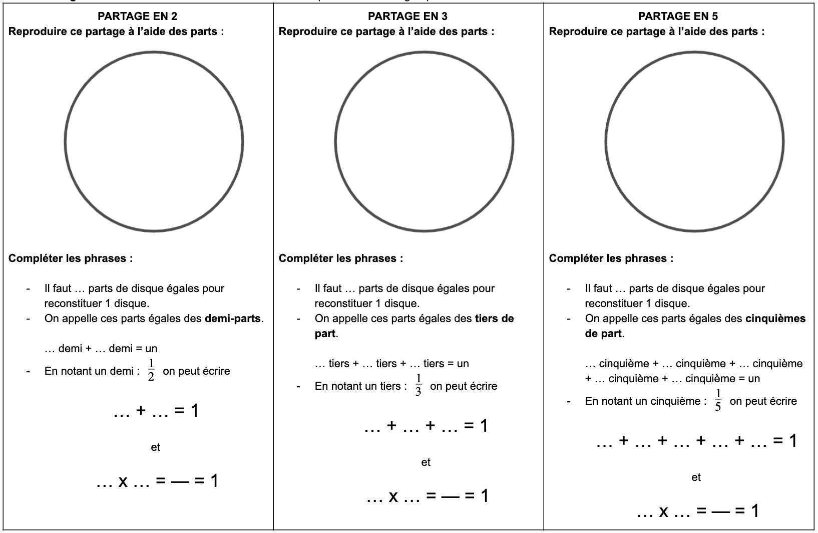 Il s'agit dans cette activité de faire émerger le concept de fractions de l'unité de construire leur rapport à l'unité :